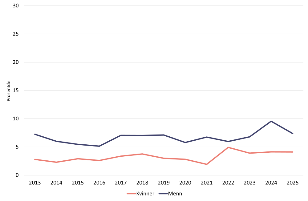 Ein høgare del menn enn kvinner oppgir bruk av cannabis både nokon gong, siste 12 månader og siste 30 dagar (Helsedirektoratet, 2026). Figur 3 viser utviklinga i bruk av cannabis siste 12 månader i perioden 2013-2025 fordelt på menn og kvinner. I 2025 oppgav 7 prosent menn bruk siste 12 månader medan delen for kvinner var 4 prosent. For bruk siste 30 dagars bruk var delane 3 og 2 prosent for høvesvis menn og kvinner (Helsedirektoratet, 2026).