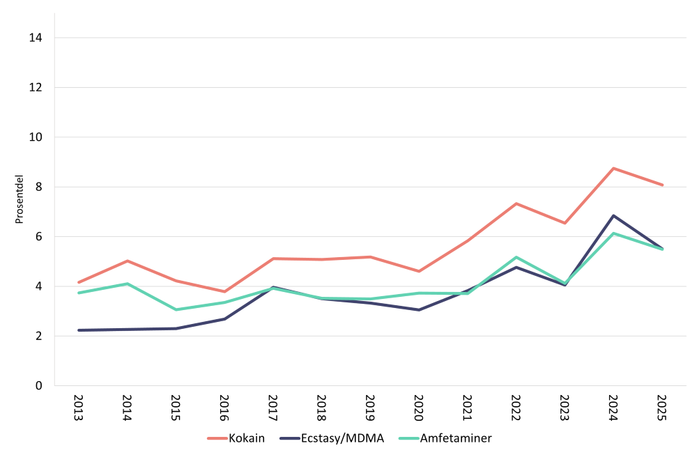 Det har vore ein auke i delane som oppgir bruk av kokain, amfetamin og ecstasy/MDMA i befolkninga mellom 2013 og 2025 (figur 4) (Helsedirektoratet, 2026). I 2013 oppgav høvesvis 4 prosent og 2 prosent å ha brukt kokain eller ecstasy/MDMA nokon gong, medan i 2025 oppgav høvesvis 8 prosent og 6 prosent slik bruk (Helsedirektoratet, 2026). I tillegg oppgav 1 prosent bruk av kokain siste 12 månader i 2015, medan 2 prosent gjorde det same i 2025 (Helsedirektoratet, 2026). Denne auken samsvarer med Kripos’ beslagsstatistikk, der det også har vore ein auke i beslag av kokain og MDMA i dei siste åra. Kokain var i 2024-2025 det rusmiddelet som vart beslaglagt hyppigast etter cannabis (Kripos, 2025). Auken blir også spegla i fleire positive funn enn tidlegare av kokain og MDMA hos ruspåverka bilførarar og i obduksjonssaker (Fevåg et al., 2025; Gjulem et al., 2025).