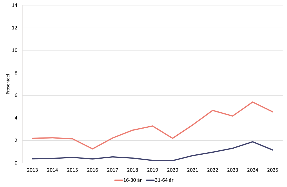 Bruk av sentralstimulerande middel siste 12 månader er mest utbreidd blant yngre (16–30 år) (Helsedirektoratet, 2026). I 2025 oppgav 4,5 prosent i denne gruppa kokainbruk siste 12 månader, mot 1,2 prosent i aldersgruppa 31–64 år (figur 5). Til samanlikning var det 2,2 prosent av dei yngste som oppgav det same i 2013, og 0,4 prosent blant dei eldste som oppgav bruk siste 12 månader i 2013. Det kan derfor tyda på at auken i kokainbruk har funne stad blant dei mellom 16 og 30 år, heller enn blant dei eldre (sjå også Bye og Moan, 2025).