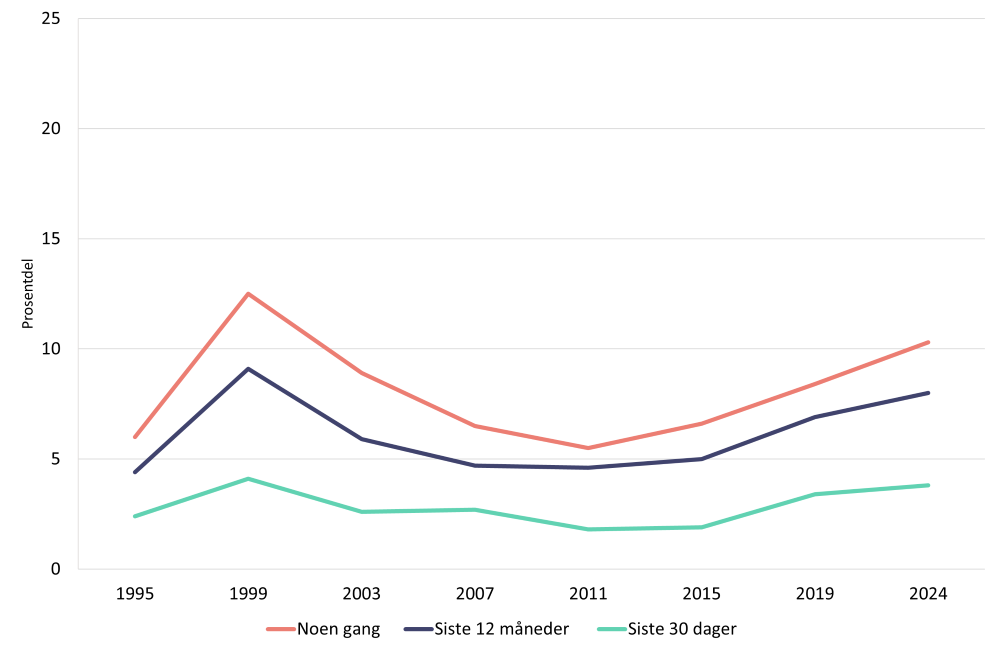 Cannabis (primært hasj og marihuana) er det mest brukte illegale rusmiddelet i Noreg (Helsedirektoratet, 2026). I den generelle befolkninga oppgav 27 prosent at dei hadde brukt cannabis nokon gong i 2025 (figur 1) (Helsedirektoratet, 2026). Dette samsvarer med Kripos’ beslagsstatistikk som viser at cannabis (hasj/marihuana) er den hyppigast beslaglagde stoffgruppa (Kripos, 2025).