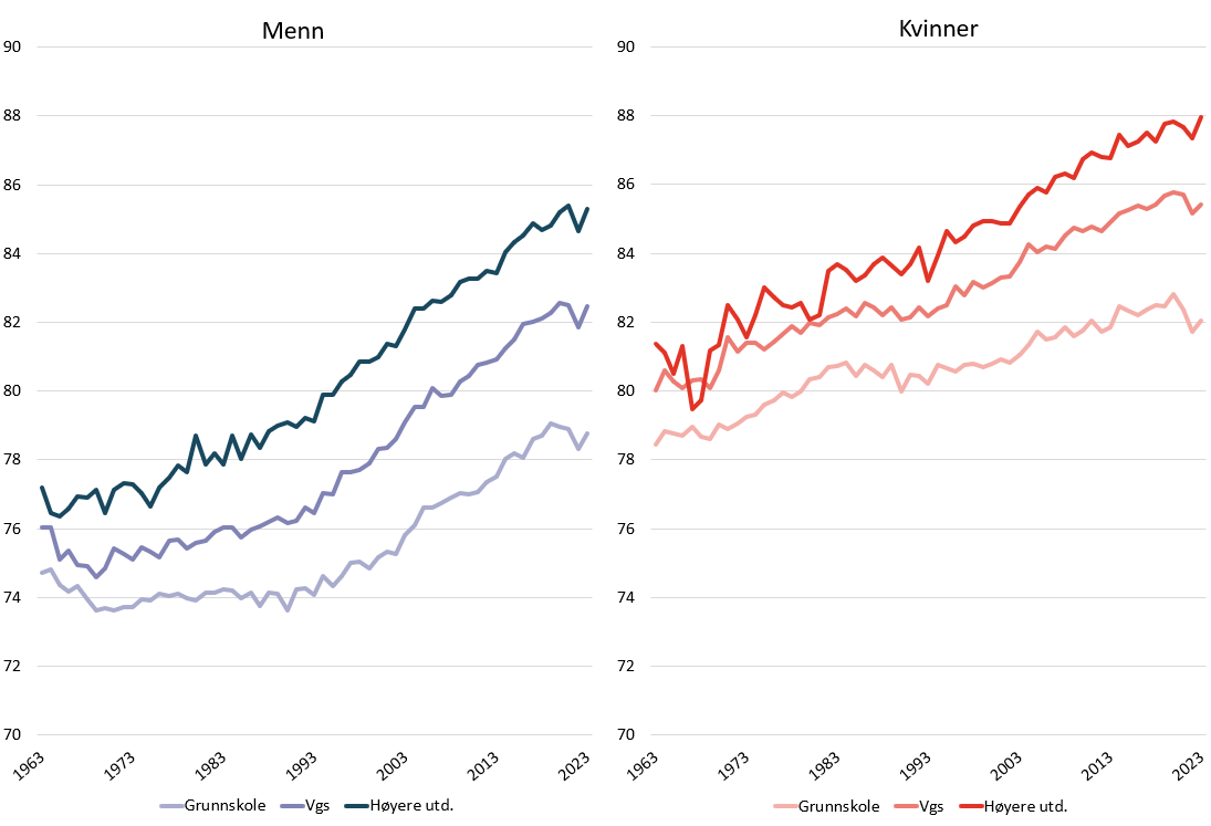 Personer med høy utdanning og inntekt lever i snitt 5–8 år lenger enn dem med lav utdanning og inntekt (figur 2). Som det kommer frem av figuren, har det vært en betydelig økning i levealder på tvers av grupper med lav, middels og høy utdanning, men forskjellen i levealder mellom gruppene består. Imidlertid er gruppen med grunnskole som høyeste utdanning halvert fra 1980 (48,8 prosent) til 2023 (23,4 prosent), mens gruppen med universitets- eller høyskoleutdanning er mer enn tredoblet i størrelse i samme periode (fra 11,3 prosent til 37,4 prosent) ifølge tall fra SSB (30). Denne trenden forventes å fortsette frem mot 2040 (31), slik at gruppen med lavest utdanning forventes å reduseres ned mot 15 prosent.
