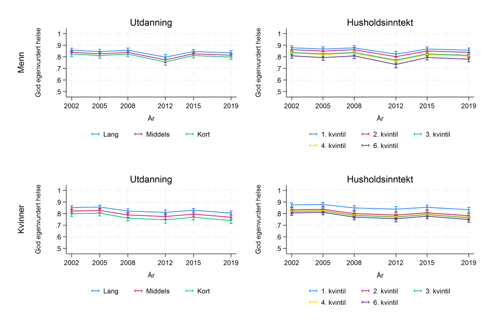 De sosiale ulikhetene i helse synes å ha holdt seg ganske stabile de siste tiårene. Sosial ulikhet i selvrapportert helse holder seg stabilt over tid, og gjelder både menn og kvinner, se figur 1 (28;29). Personer med høy utdanning og inntekt, og personer som har yrker som krever høy kompetanse rapporterer gjennomgående bedre helse enn dem med lavere utdanning, lav inntekt og arbeid innenfor yrker uten høye formelle kompetansekrav. De som står utenfor arbeidslivet, har klart lavest selvrapportert helse (28;29).