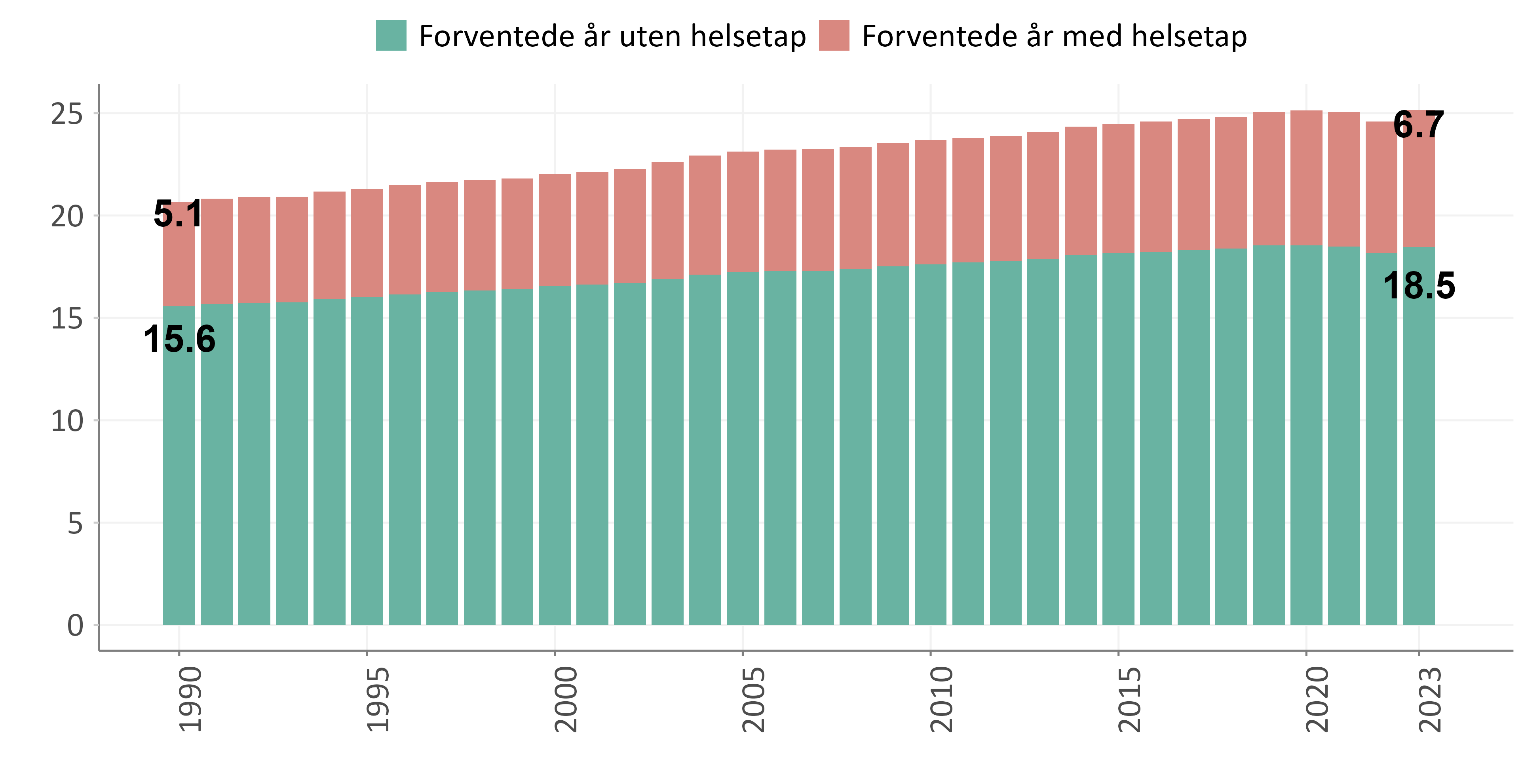 Mens forventet levealder gir informasjon om utviklingen i dødelighet i befolkningen, gir forventede friske leveår informasjon om utviklingen i både dødelig og sykelighet. Forventede friske leveår var av GBD beregnet til 70,7 år for kvinner og 70,3 år for menn i 2023, tilsvarende en økning på 2,7 år for kvinner og 5,7 år for menn siden 1990. Økningen i forventede friske leveår var dermed lavere enn økningen i forventet levealder mellom 1990 og 2023. Dette kan tyde på at vi ikke har hatt like stor suksess med å redusere sykelighet i befolkningen som vi har hatt med å redusere tidlig død. Den lavere utviklingen i friske leveår rammer flere aldersgrupper, både unge, arbeidsføre og eldre.