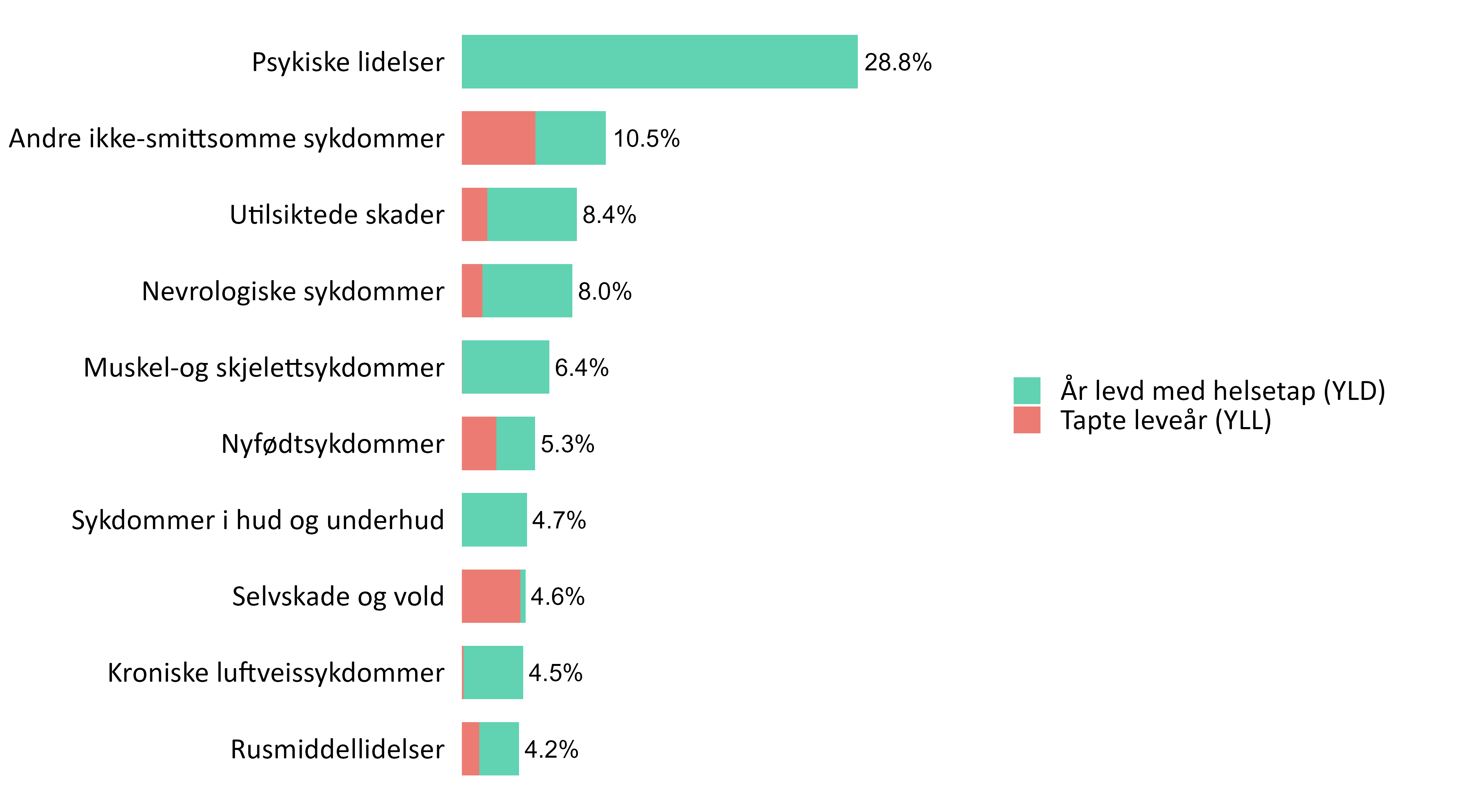 Det er imidlertid viktige forskjeller i hvilke sykdommer som bidrar til helsetap mens man lever, og hvilke sykdommer som bidrar til tidlig død. I det følgende vil vi gi en oversikt over de viktigste årsakene til helsetap og tapte leveår i Norge totalt, mens vi i del 3.6 vil gi en mer detaljert beskrivelse av de viktigste årsakene fordelt på aldersgrupper.