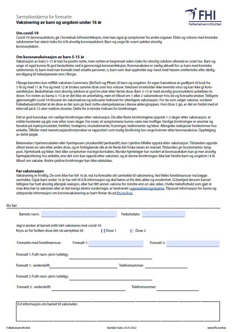 Samtykkeskjemaer - vaksinasjon av barn og unge under 16 år