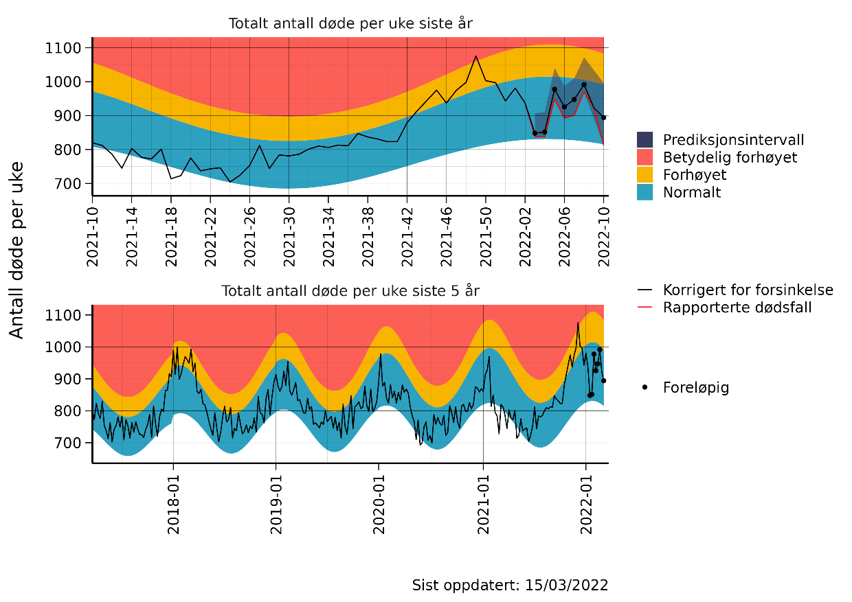 Det er registrert flere dødsfall enn forventet («overdødelighet») i åtte uker i månedene før årsskiftet. Utover dette, har antall ukentlig antall dødsfall vært på forventet og under forventet nivå, gjennom hele pandemien.