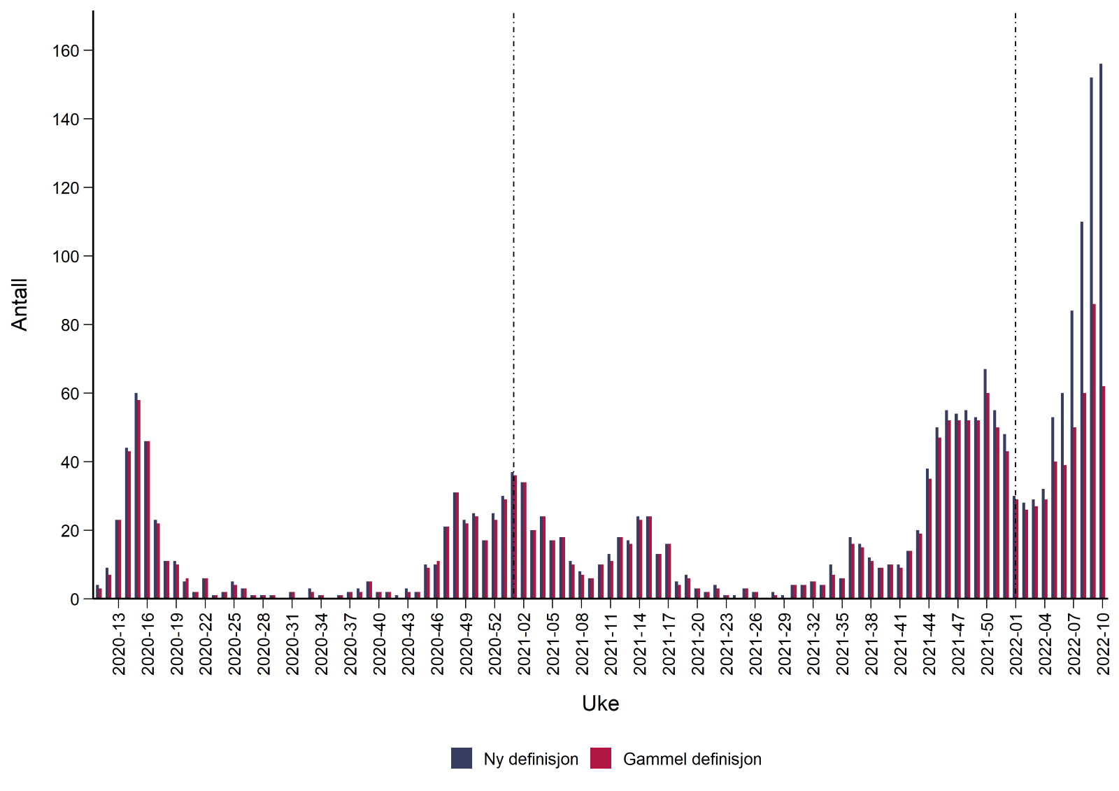 Ta meg til forsidenFrem til uke 10 2022 har overvåkingen av covid-19 assosierte dødsfall kun inkludert dødsfall med en bekreftet SARS-CoV-2 prøve i MSIS-registeret. Overvåkingen endres nå til å også inkludere dødsfall uten en bekreftet SARS-CoV-2 prøve i MSIS, med tilbakevirkende kraft fra starten av pandemien. Den nye definisjonen gjør at det nå totalt er registrert 2169 dødsfall. Det er 357 flere dødsfall enn det ville vært med den gamle definisjonen. Økningen skyldes først og fremst dødsfall i 2022, særlig de siste seks ukene (figur 1).