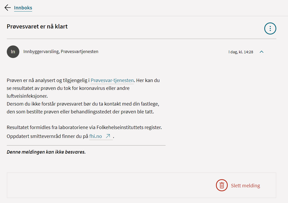 Prøvesvaret finner du i Prøvesvar-tjenesten på Helsenorge. Den finner du lenke til fra ulike steder, som for eksempel på Helsenorge-forsiden, i menyen, eller i oversikten over tjenester på forsiden. Du kan også gå til meldingen du har fått i innboksen og følge lenken i den til Prøvesvar-tjenesten. Meldingen kommer frem ved å klikke på navnet ditt som står oppe til høyre på siden når du er pålogget. Der ser du at du har fått en ny melding. Denne er litt mer utfyllende enn varslet som kom på SMS eller e-post, men inneholder ikke selve prøvesvaret.