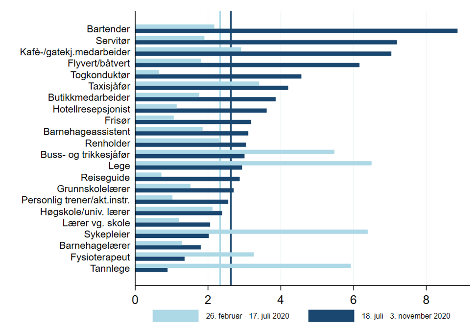 - Mest utsatt i den andre perioden var ansatte i serveringsbransjen, slik som bartendere og servitører, dessuten fly- og båtverter. Antallet covid-19-tilfeller var fra 6,2 til 8,9 per 1000.