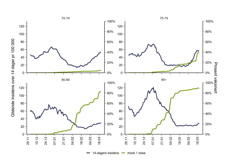 Figuren viser en sammenstilling av andel vaksinerte i de eldste aldergruppene, og glidende 14-dagers insidens (antall nye tilfeller per 14 dager per 100 000 innbyggere for hver aldersgruppe) av covid-19 fra november 2020 frem til 21. Mars 2021.