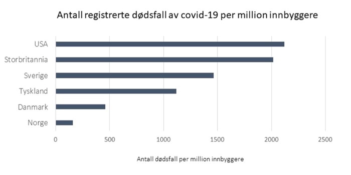 Med samme antall dødsfall per million som for eksempel Storbritannia, ville Norge hatt over 10 000 dødsfall. Figuren nedenfor viser andelen koronarelaterte dødsfall i Norge i forhold til land det er naturlig å sammenligne med.
