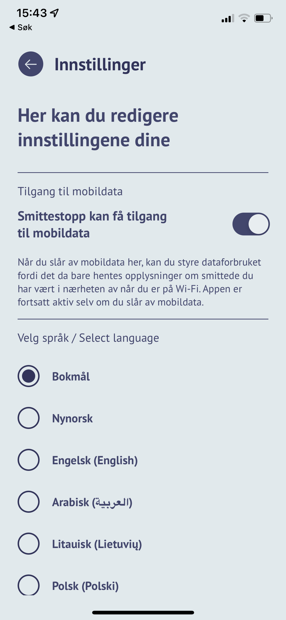 - Apple: iOS-enheter må være oppdatert til minimum versjon iOS 12.5. Hvis telefonen din ikke er oppdatert, vil du få beskjed om at du må oppdatere operativsystemet når du prøver å laste ned appen.