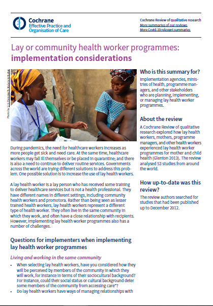 |Sammendrag av Cochrane-oversikter som kan være relevante ved planlegging av tiltak for å styrke helsetjenesten ved pandemier. Sammendragene er sortert tematisk.