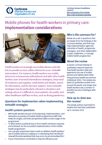 Cochrane har utarbeidet en serie oversikter om m-helsestrategier for å støtte WHOs nylig utgitte retningslinjer for digital helse. Noen av disse oversiktene er presentert i to sammendrag nedenfor. Flere sammendrag vil bli inkludert når nye oversikter blir offentlig tilgjengelig.