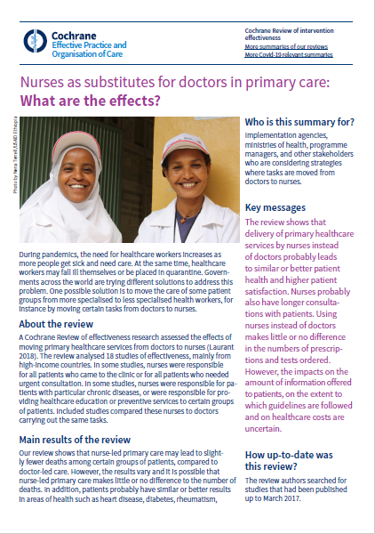 Under pandemier øker behovet for helsepersonell etter hvert som flere blir syke og trenger pleie. Samtidig kan helsepersonell selv bli syke eller satt i karantene. I tillegg må helsesystemet fortsette å levere rutinemessige tjenester. Regjeringer over hele verden prøver ut forskjellige løsninger for å løse disse problemene. Én mulig løsning er å flytte omsorgen for noen pasientgrupper fra helsearbeidere med høyere opplæringsnivå til helsearbeidere med lavere opplæringsnivå, ofte omtalt som ‘oppgaveforskyvning’. Cochrane EPOC har utarbeidet flere kunnskapsoversikter som utforsker dette emnet. Her er fire sammendrag: