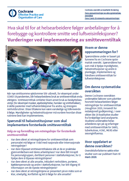 Når nye smittsomme sykdommer blir utbredt, som under covid-19-pandemien, blir helsearbeideres bruk av smitteverntiltak enda viktigere. Smitteverntiltak omfatter blant annet å bruke beskyttelsesutstyr (for eksempel masker, øyebeskyttelse, hansker og smittefrakker), å skille pasienter med luftveisinfeksjoner fra andre og ha strengere renholdsrutiner. Disse tiltakene kan være vanskelige og tidkrevende å følge. Myndigheter og helseinstitusjoner må vurdere hvordan disse rutinene best kan implementeres. Her er lenke til norsk sammendrag av oversikten: