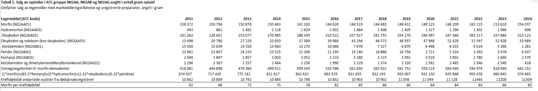 Grossistbasert legemiddelstatistikk ved Folkehelseinstituttet har gitt statistikk for salg av opioider i ATC-gruppe N02AA, N02AB og N02AG angitt i antall gram opioid i perioden 2011-2024. Tallene omfatter salg av legemidler med markedsføringstillatelse og uregistrerte preparater. ATC/DDD versjon 2025 er benyttet.