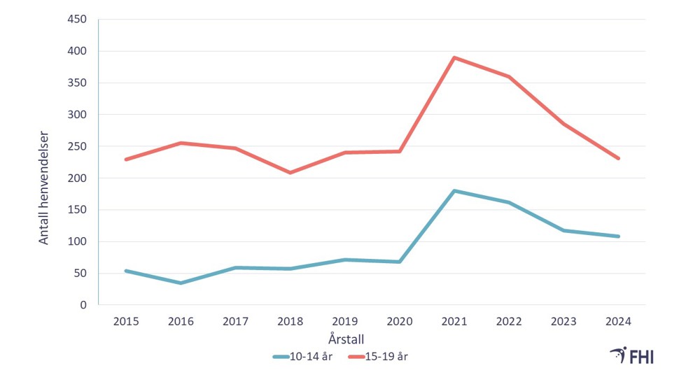 Siden 2021 har antall henvendelser i denne aldergruppen gått ned. I 2024 var det 44 henvendelser, og andelen henvendelser som gjaldt selvforskyldte inntak var 71 %.