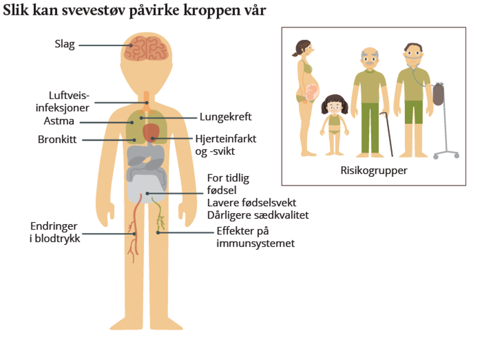 Personer med luftveissykdommer som astma, kronisk obstruktiv lungesykdom (KOLS), hjerte- og karsykdommer og diabetes er mest følsomme for svevestøv. Eldre, barn og gravide regnes også som sårbare grupper.