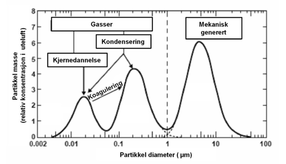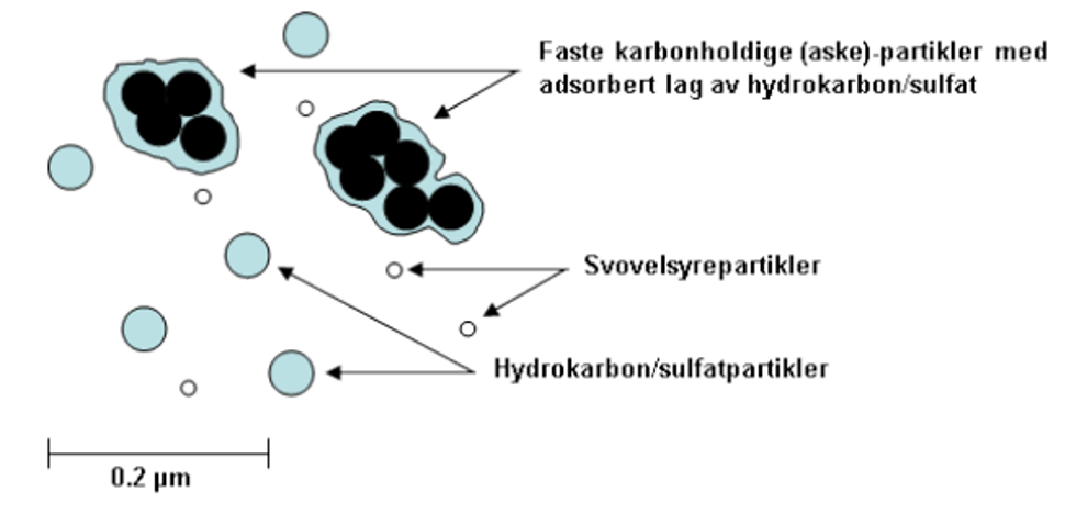 Aitkenpartikler (enkeltkjernepartikler) er primære (nydannete) partikler fra eksos eller lignende forbrenningsavgasser, og består hovedsakelig av partikler med størrelse rundt 0,02 µm (se figur 2). Slike partikler observeres hovedsakelig bare i nærheten av den aktuelle kilden, og vokser raskt og danner akkumulasjonspartikler som utgjør den neste størrelsesfraksjonen. Akkumulerte partikler er gjerne eldre, koagulerte forbrenningspartikler med adsorberte forbindelser, og består hovedsakelig av partikler med størrelse rundt 0,2 µm [2]. Det vil dessuten forekomme noe mekanisk generert støv i PM2,5, selv om partiklene i denne størrelsesfraksjonen i hovedsak betraktes som forbrenningspartikler. Dessuten kan forbrenningsreaksjoner gi opphav til grove partikler i form av større partikkelaggregater. Med hensyn til kjemisk sammensetning går allikevel det viktigste skillet mellom partikler mindre enn 1 µm, som i hovedsak er dannet fra forbrenningsgasser, og partikler over 1 µm, som normalt stammer fra mekaniske slitasjeprosesser [3, 4].