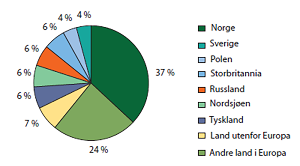 | NH4+ | - | Eksos fra motorkjøretøyer | NH3 fra ville dyr, urørt jord | NH3 fra husdyrhold, kloakk og gjødslet mark |