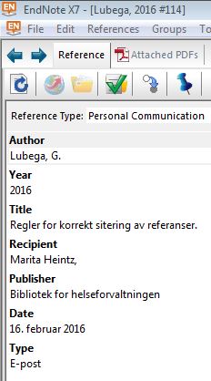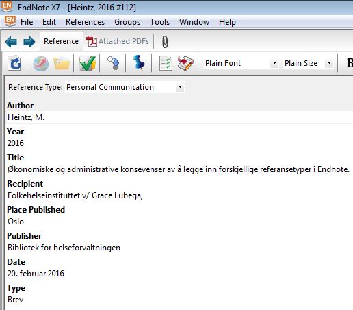 - Heintz, M. (20. februar 2016). Økonomiske og administrative konsekvenser av å legge inn forskjellige referansetyper i EndNote. [Brev]. Sendt til Folkehelseinstituttet v/ Grace Lubega. (EndNote-eksempel)