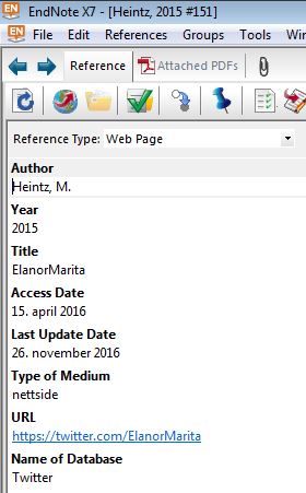 - Heintz, M. (26. november 2016). ElanorMarita. Twitter [nettside]. Hentet 15. april 2016, fra https://twitter.com/ElanorMarita (EndNote-eksempel)