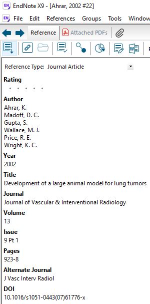 - Ahrar, K., Madoff, D. C., Gupta, S., Wallace, M. J., Price, R. E., & Wright, K. C. (2002). Development of a large animal model for lung tumors. Journal of Vascular & Interventional Radiology, 13(9 Pt 1), 923-928. https://doi.org/10.1016/s1051-0443(07)61776-x (EndNote-eksempel)