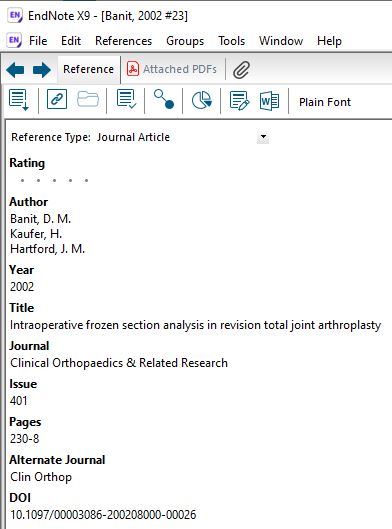 - Banit, D. M., Kaufer, H., & Hartford, J. M. (2002). Intraoperative frozen section analysis in revision total joint arthroplasty. Clinical Orthopaedics & Related Research, (401), 230-238. https://doi.org/10.1097/00003086-200208000-00026 (EndNote-eksempel)