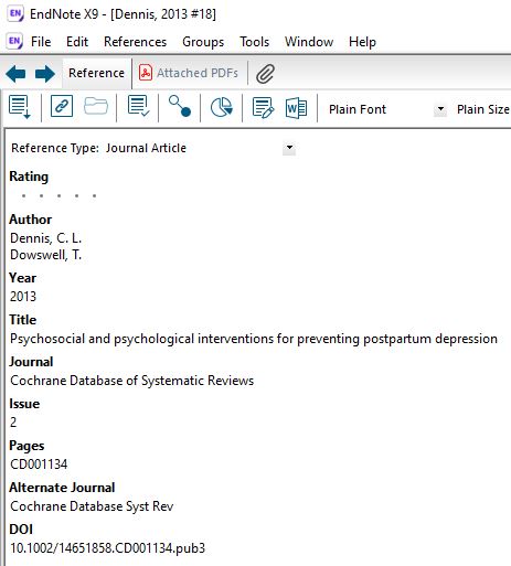 - Dennis, C. L., & Dowswell, T. (2013). Psychosocial and psychological interventions for preventing postpartum depression. Cochrane Database of Systematic Reviews, (2), CD001134. https://doi.org/10.1002/14651858.CD001134.pub3 (EndNote-eksempel)