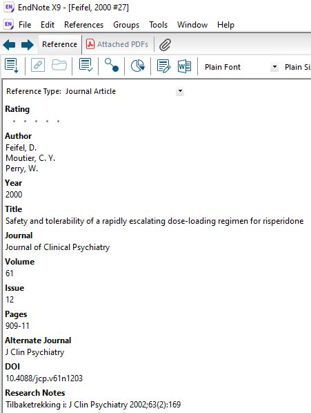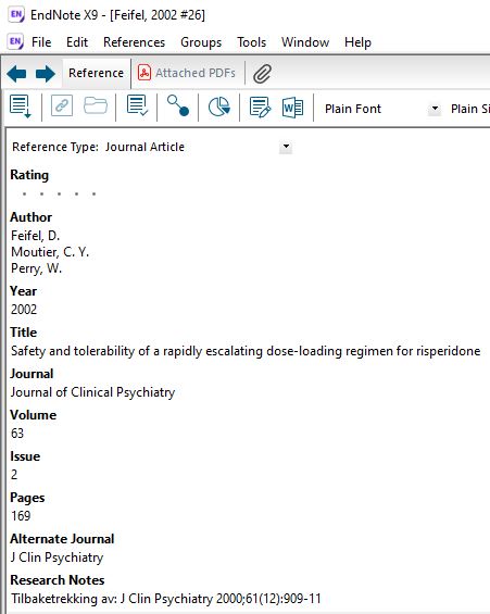 - Feifel, D., Moutier, C. Y., & Perry, W. (2002). Safety and tolerability of a rapidly escalating dose-loading regimen for risperidone. Journal of Clinical Psychiatry, 63(2), 169. (EndNote-eksempel) Tilbaketrekking av: J Clin Psychiatry 2000;61(12):909-11.