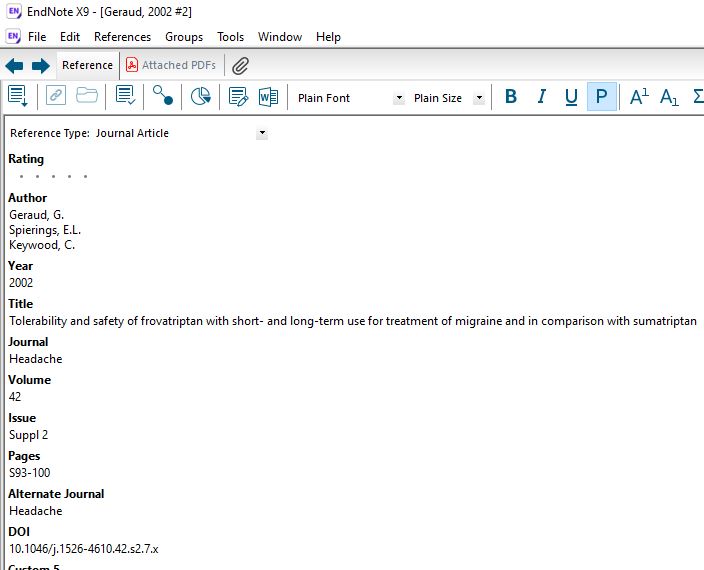- Geraud, G., Spierings, E. L., & Keywood, C. (2002). Tolerability and safety of frovatriptan with short- and long-term use for treatment of migraine and in comparison with sumatriptan. Headache, 42(Suppl 2), S93-100. https://doi.org/10.1046/j.1526-4610.42.s2.7.x (EndNote-eksempel)