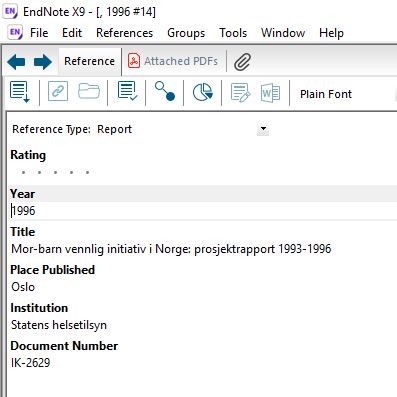 - Mor-barn vennlig initiativ i Norge: prosjektrapport 1993-1996. (1996). (IK-2629). Oslo: Statens helsetilsyn. (EndNote-eksempel)