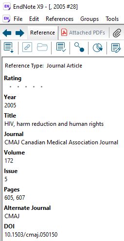 - HIV, harm reduction and human rights. (2005). CMAJ Canadian Medical Association Journal, 172(5), 605, 607. https://doi.org/10.1503/cmaj.050150 (EndNote-eksempel)