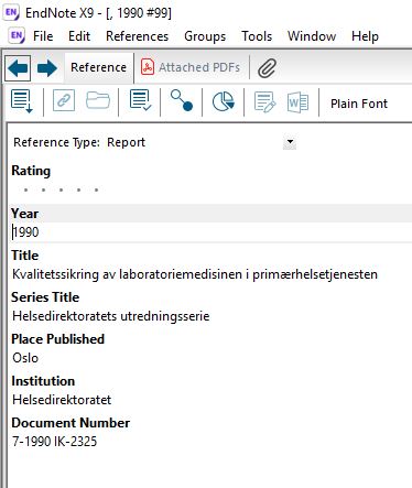 - Kvalitetssikring av laboratoriemedisinen i primærhelsetjenesten. (1990). (Helsedirektoratets utredningsserie 7-1990 IK-2325). Oslo: Helsedirektoratet. (EndNote-eksempel)