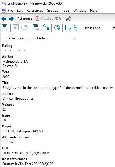 - Malinowski, J. M., & Bolesta, S. (2000). Rosiglitazone in the treatment of type 2 diabetes mellitus: a critical review. Clinical Therapeutics, 22(10), 1151-1168; diskusjon 1149-1150. Erratum i: Clin Ther 2001;23(2):309. https://doi.org/10.1016/s0149-2918(00)83060-x (EndNote-eksempel)