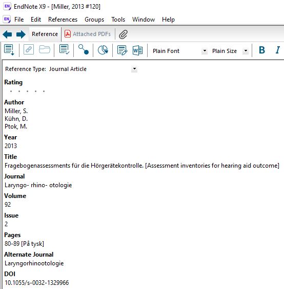 - Miller, S., Kühn, D., & Ptok, M. (2013). Fragebogenassessments für die Hörgerätekontrolle. [Assessment inventories for hearing aid outcome]. Laryngo- Rhino- Otologie, 92(2), 80-89 [På tysk]. https://doi.org/10.1055/s-0032-1329966 (EndNote-eksempel)