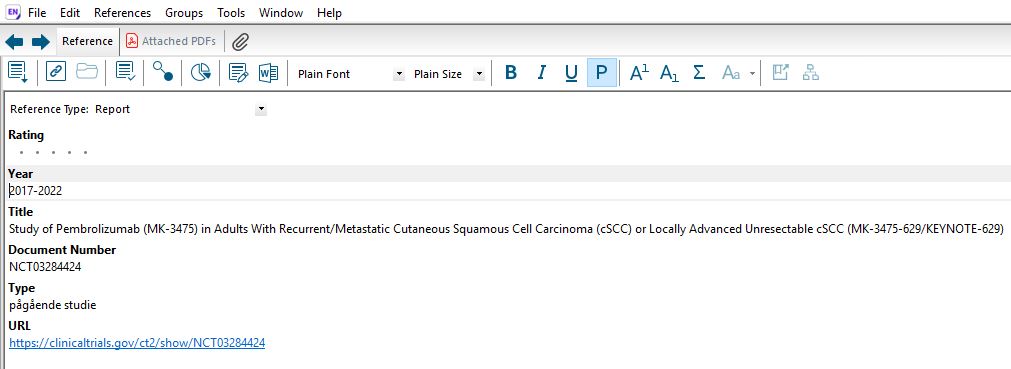 - Study of Pembrolizumab (MK-3475) in Adults With Recurrent/Metastatic Cutaneous Squamous Cell Carcinoma (cSCC) or Locally Advanced Unresectable cSCC (MK-3475-629/KEYNOTE-629). (2017-2022). [pågående studie]. (NCT03284424). Hentet fra https://clinicaltrials.gov/ct2/show/NCT03284424 (EndNote-eksempel)