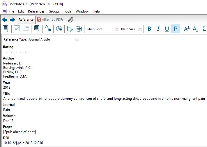 - Pedersen, L., Borchgrevink, P. C., Breivik, H. P., & Fredheim, O. M. (2013). A randomized, double-blind, double-dummy comparison of short- and long-acting dihydrocodeine in chronic non-malignant pain. Pain, Dec 15 [Epub ahead of print]. https://doi.org/10.1016/j.pain.2013.12.016 (EndNote-eksempel)