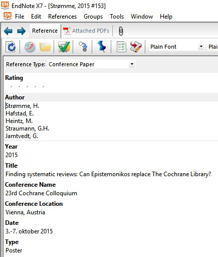 - Strømme, H., Hafstad, E., Heintz, M., Straumann, G. H., & Jamtvedt, G. (2015). Finding systematic reviews: Can Epistemonikos replace The Cochrane Library? Poster på 23rd Cochrane Colloquium, Vienna, Austria 3.-7. oktober 2015. (EndNote-eksempel)