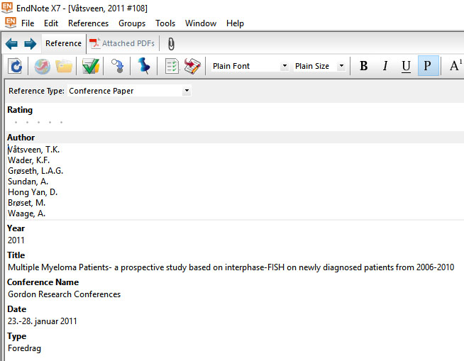 - Våtsveen, T. K., Wader, K. F., Grøseth, L. A. G., Sundan, A., Hong Yan, D., Brøset, M., & Waage, A. (2011). Multiple Myeloma Patients- a prospective study based on interphase-FISH on newly diagnosed patiens from 2006-2010. Foredrag på Gordon Research Conferences 23.-28. januar 2011. (EndNote-eksempel)