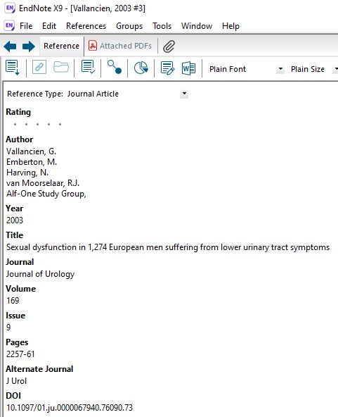 - Vallancien, G., Emberton, M., Harving, N., van Moorselaar, R. J., & Alf-One Study Group. (2003). Sexual dysfunction in 1,274 European men suffering form lower urinary tract symptoms. Journal of Urology, 169(9), 2257-2261. https://doi.org/10.1097/01.ju.0000067940.76090.73 (EndNote-eksempel)