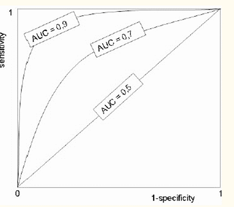 Arealet under kurven (AUC) er et annet mål på en tests nøyaktighet. Figur 2 illustrerer dette målet i et plott med ROC-kurver (receiver operating characteristic kurver). AUC på 0,5 betyr at testen ikke gir noen informasjon om en person har en tilstand. AUC=1 betyr at testen klassifiserer alle friske og alle syke helt korrekt.