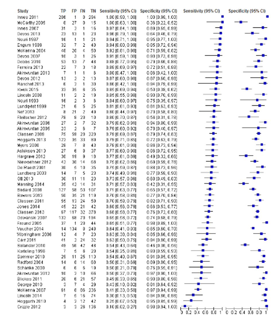 Figur 3. Eksempel på dobbelt balansediagram (coupled forest plot) over diagnostisk nøyaktighet.