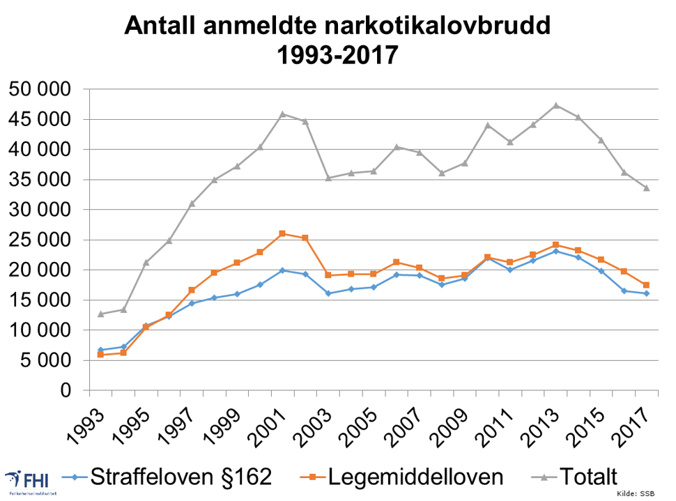 Figur 1 viser utviklingen i antall anmeldte narkotikalovbrudd siden 1993. Som det framgår økte antall slike lovbrudd dramatisk i løpet av 1990-tallet, mens det etter årtusenskiftet har vært mer eller mindre stabilt, selv om vi ser noe variasjon fra år til år. I perioden 2013 til 2017 har det imidlertid vært en nedadgående trend.