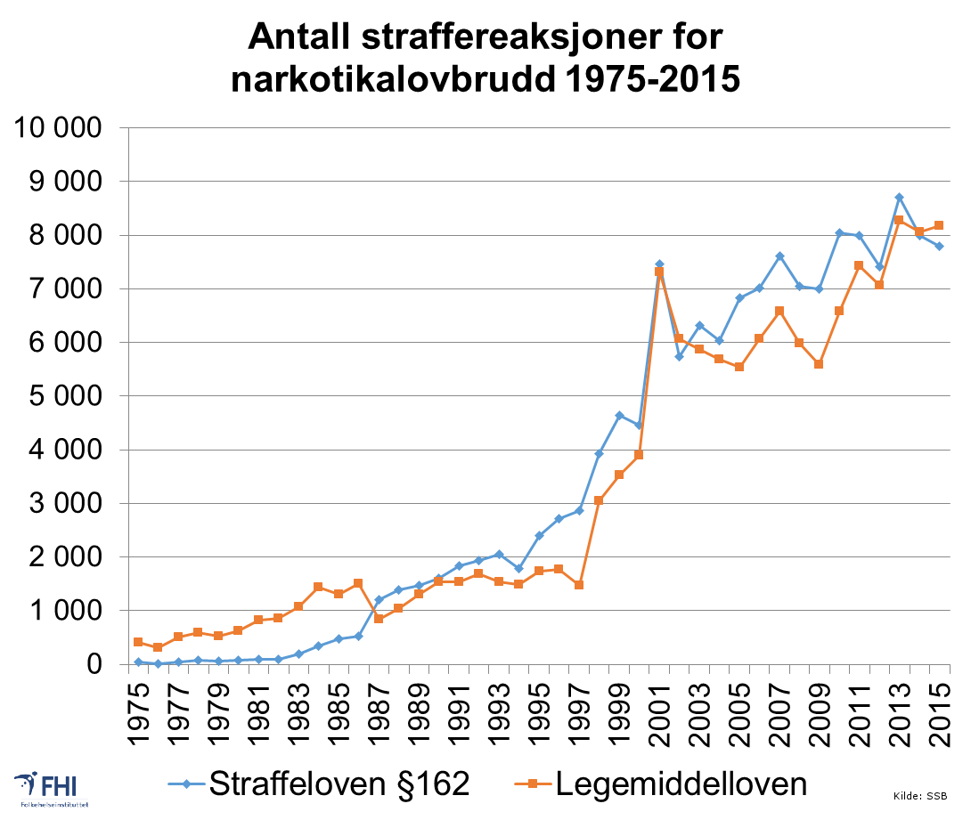 Figur 2 viser utviklingen i antall straffereaksjoner for narkotikalovbrudd gjennom mer enn 40 år. Etter en relativt stabil utvikling på 70- og 80-tallet, økte antall reaksjoner drastisk fra midten av 90-tallet og frem til tusenårsskiftet, med en foreløpig topp i 2001 der det totale antallet passerte 14 500. Antallet slike reaksjoner var deretter nedadgående, før det igjen økte og har de siste årene passert 2001-nivået. I 2013, som er året med høyest antall, ble det registrert nært 17 000 reaksjoner. I 2014 og 2015 var antallet igjen svakt nedadgående og reaksjonene for brudd på legemiddelloven var da høyere enn for brudd på straffeloven.