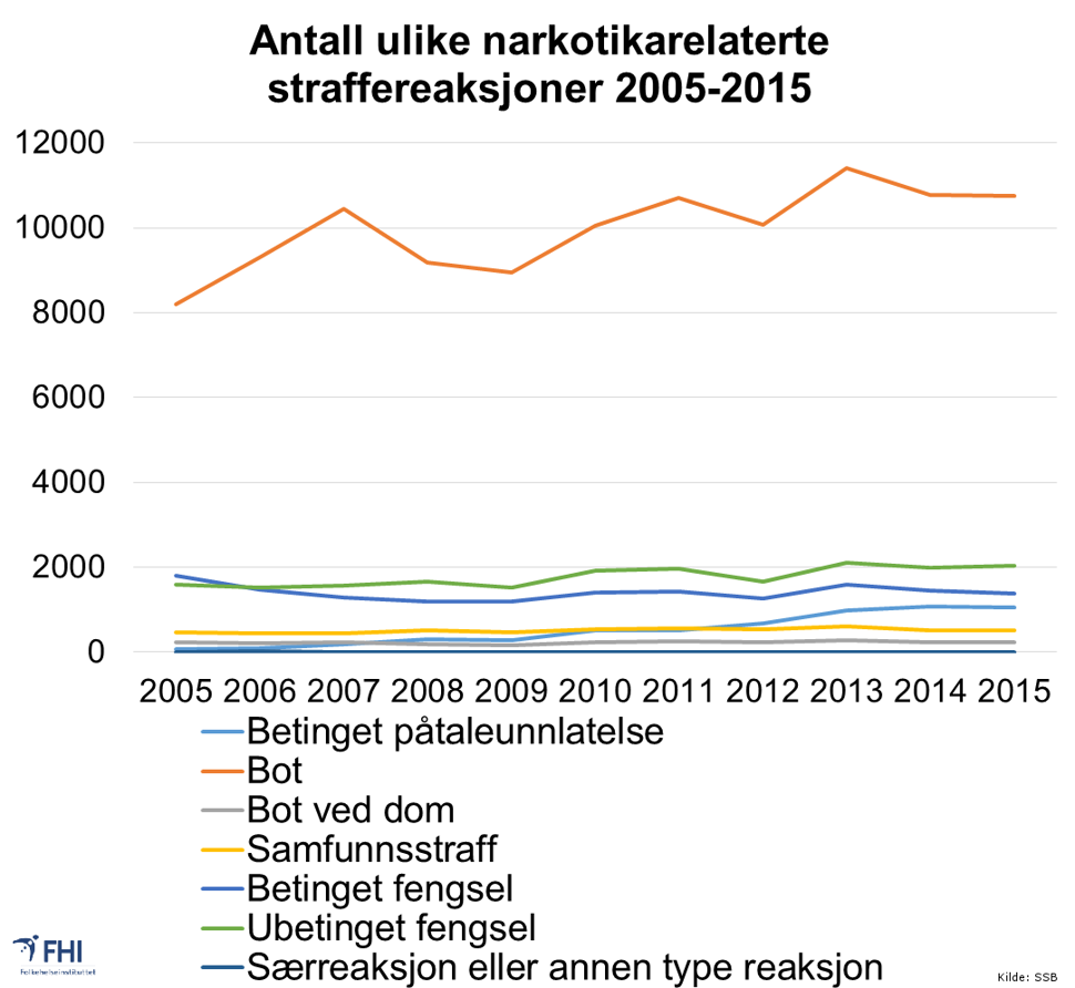 Figur 3 viser utviklingen i antall ulike straffereaksjoner for narkotikalovbrudd i perioden 2005 til 2015. Utviklingen er stabil gjennom hele perioden og viser at bøter er den klart mest brukte reaksjonen. I 2015 utgjorde de nær 11 000 utstedte bøtene over 67 % av de ulike narkotikarelaterte straffereaksjonene.