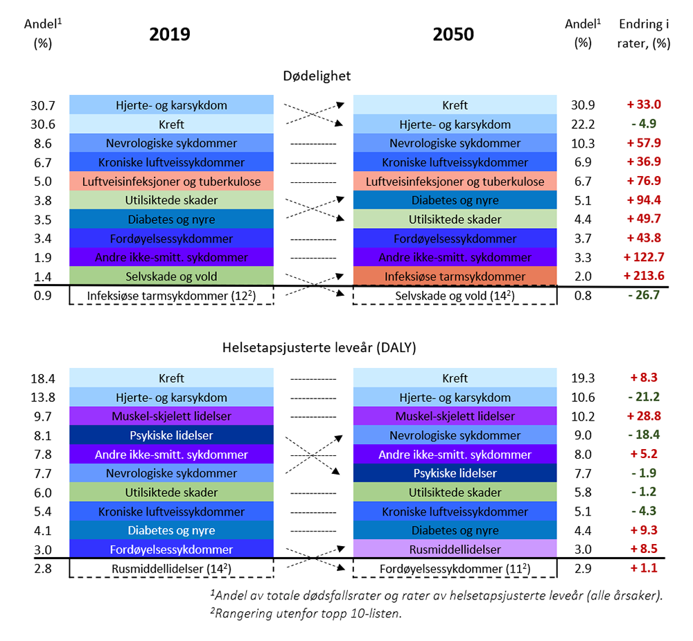 Tabell 1.1 viser framskrevne endringer i de ti største årsakene til dødelighet og sykdomsbyrde mellom 2019 og 2050. Endringer i både plassering og relativ andel er påvirket av utviklingen i andre sykdomsgrupper, mens endringer i rater beskriver endringer i sykdomsgruppen selv. På overordnet nivå viser framskrivingen ingen endringer i andelen dødelighet og sykdomsbyrde som tilskrives ikke-smittsomme sykdommer fra 2019 (hhv. 87,5 prosent av alle dødsfall og 86,5 prosent av alle helsetapsjusterte leveår) til 2050 (hhv. 86,6 prosent av alle dødsfall og 86,5 prosent av alle helsetapsjusterte leveår).