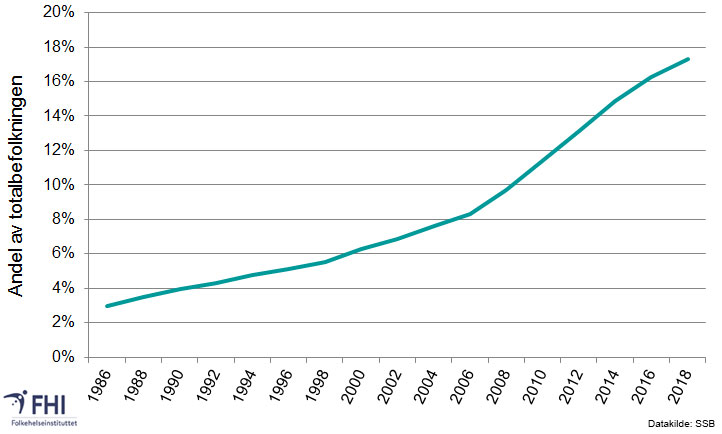 - Andelen innvandrere og norskfødte med innvandrerforeldre har økt kraftig gjennom de siste tiårene.
