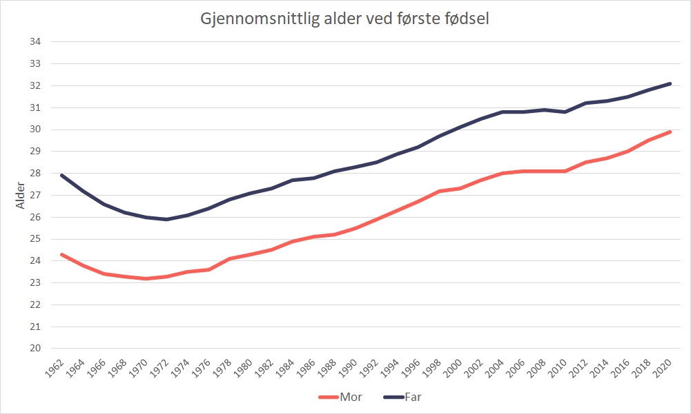 Kvinners gjennomsnittsalder ved første fødsel har også vært stigende, fra 27,3 år i 2000, 28,1 år i 2010 til 30,1 år i 2021.Tilsvarende tall for menn er 30,1 år i 2000, 30,8 år i 2010 og 32,1 år i 2021 (SSB, 2022n).